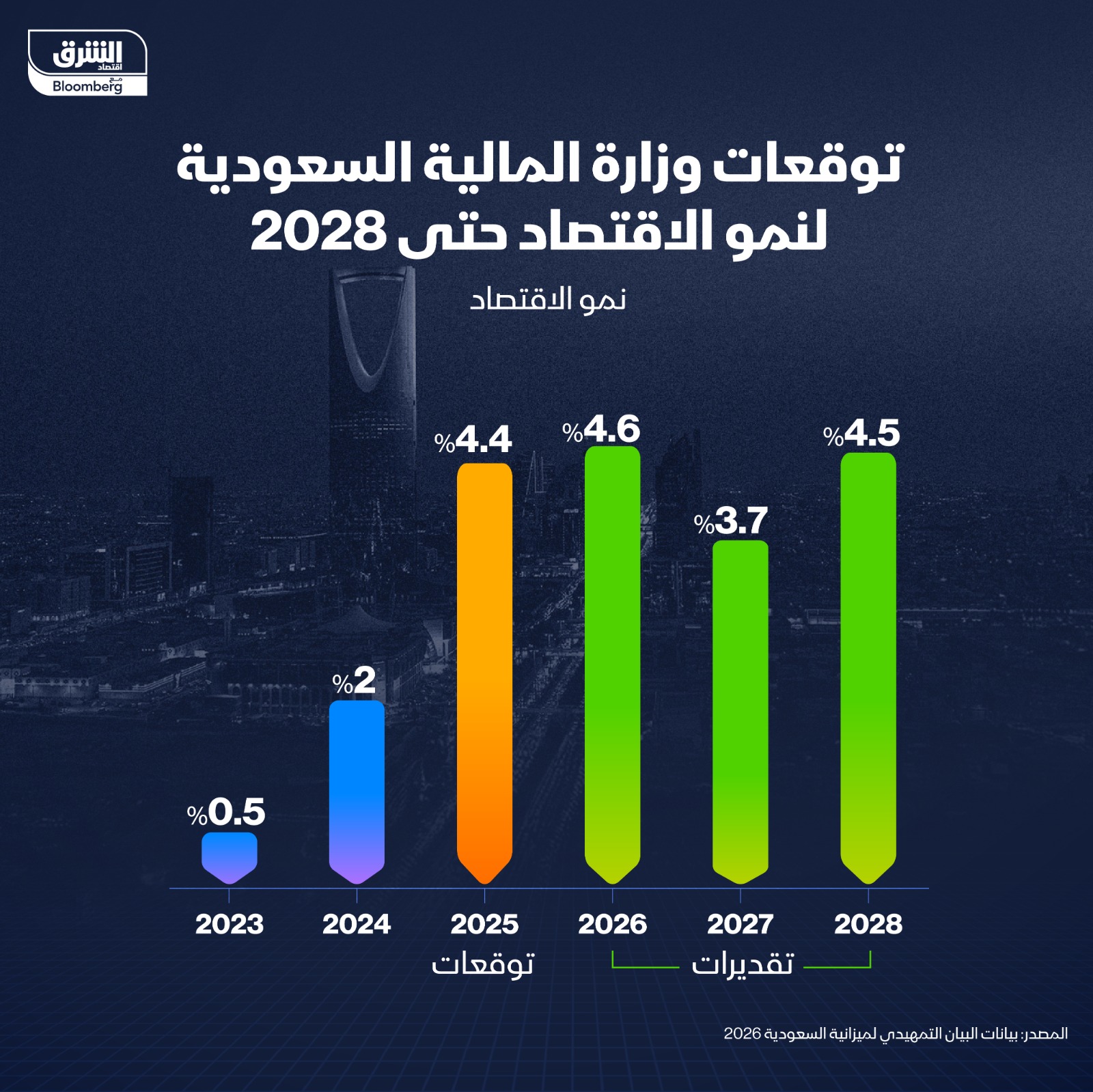 رفعت السعودية توقعات نمو اقتصادها للعام المقبل إلى 4.6% بدلاً من 3.5% في تقديرات سابقة، مدفوعاً بشكلٍ أساسي بالنمو المتوقع للناتج المحلي للأنشطة غير النفطية، وفقاً للبيان التمهيدي لميزانية عام 2026 الصادر عن وزارة المالية يوم الثلاثاء.
